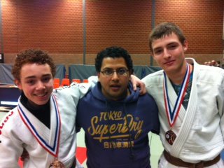 Ondanks de nieuwigheid stonden beide judoka’s echter goed te knokken. Fabian moest in een van de sterkste poules van de dag twee keer zijn meerdere erkennen in twee oud Nederlands kampioenen geen schande dus. Tommy was ook goed aan het knokken. Na zijn eerste partij vrij snel te hebben gewonnen moest hij de tweede ronde tegen de 1 jaar oudere en sterke Joel van Os. Helaas lukte het Tommy niet deze oud Nederlands kampioen te werpen en dus ging de pot verloren. Aangezien Tommy al zijn partijen in de herkansingsronde als nog won werd hij uiteindelijk toch nog derde. Ook Davy Goedhart presteerde met het behalen van even eens een bronzen plak erg goed. Helaas dus nog geen NK kwalificaties in deze klasse, maar we zitten er wel erg dicht bij. ‘Volgend jaar is iedereen een jaar ouder dus ik heb er alle vertrouwen in’ aldus een tevreden coach. Wat ook wel even vermeld mag worden is dat Cees “de Rots” en Peter “het Oog” ook in actie kwamen maar dan als scheidsrechter!!