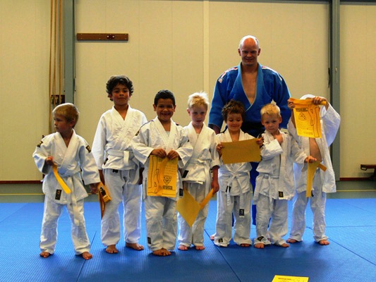 De kinderen die examen deden voor de gele slip bij jeugd judoleider Peter