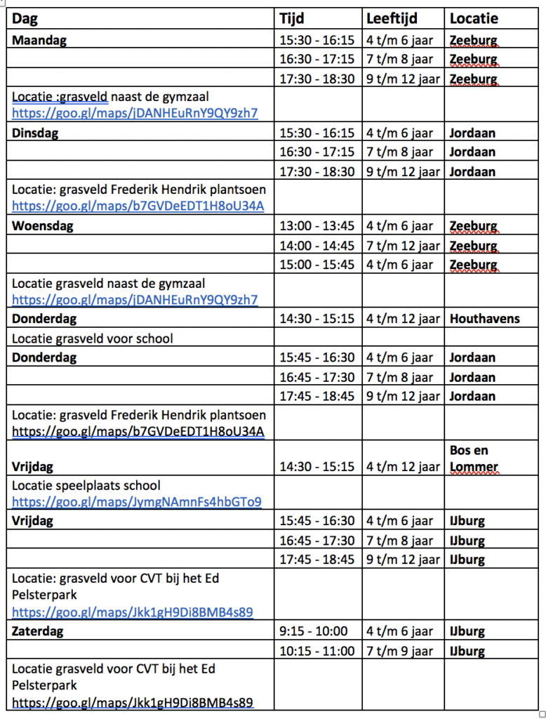In de bijlage vindt u het lesrooster en de locaties waarop wij de lessen gaan geven. Een belangrijke voorwaarde voor ons is dat wij les kunnen geven op een geschikt grasveld. Voor sommige locaties is de les dus niet naast de locaties waar de binnen lessen gegeven worden. Wij starten nog niet met alle bestaande reguliere lestijden en dagen. Sommige judoka’s moeten eventueel op een andere dag/tijd mee doen. Het rooster bestaat nu uit 20 lessen. Wij hopen natuurlijk weer snel terug te kunnen naar het normale rooster van 30 lessen. Maar dit hangt af van hoeveel Judoka’s mee gaan doen aan het buiten programma, zodat wij bij eventuele te grote groepen weer lestijden/dagen kunnen toevoegen aan het buiten programma. Kijk goed in welke les je mee kan doen, achter elke lestijd staan ook de leeftijden